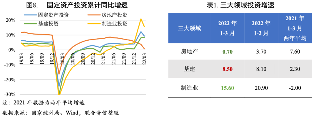 固定投資總體平穩,基建投資發力明顯,制造業投資邊際回落,房地產投資繼續惡化。2022年一季度全國固定資產投資(不含農戶)10.49萬億元,同比增長9.30%,雖然較1-2月有所回落,但仍然在相對高位。三大領域投資方面,房地產開發投資繼續惡化,一季度房地產銷售面積與銷售額同比下降超過10%,銷售端惡化抑制地產投資,房企對于拿地、新開工較為謹慎;基建投資繼續發力,重大工程項目集中落地開工,體現了財政提前發力、穩增長政策拉動投資的作用;制造業投資仍處高位,但3月邊際回落,政策利好、出口和工業生產的強勢仍是支撐因素。未來,隨著專項債券資金撥付使用進度加快、條件成熟的重大項目繼續推動,基建投資有望持續發力,擴大投資對經濟的拉動作用。