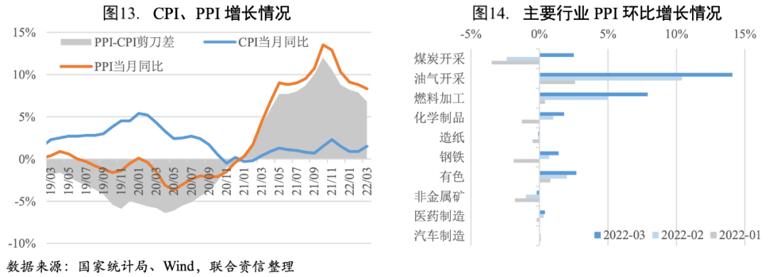 一季度CPI同比漲幅總體平穩,PPI同比漲幅逐月回落。CPI方面,受國內多點散發疫情和國際能源價格波動等共同影響,2022年一季度CPI同比增長1.10%,豬肉等食品價格下跌對沖了部分能源價格上漲推動的上行空間。PPI方面,受原油、有色金屬等國際大宗商品價格上漲等因素影響,一季度PPI同比增長8.70%,各月PPI同比增速回落幅度有所減緩,環比增速由降轉漲,上行動力增強,輸入型通脹壓力抬升。地緣政治沖突等因素導致國際能源和有色金屬價格劇烈波動,帶動國內油氣開采、燃料加工、有色金屬等相關行業價格上行。