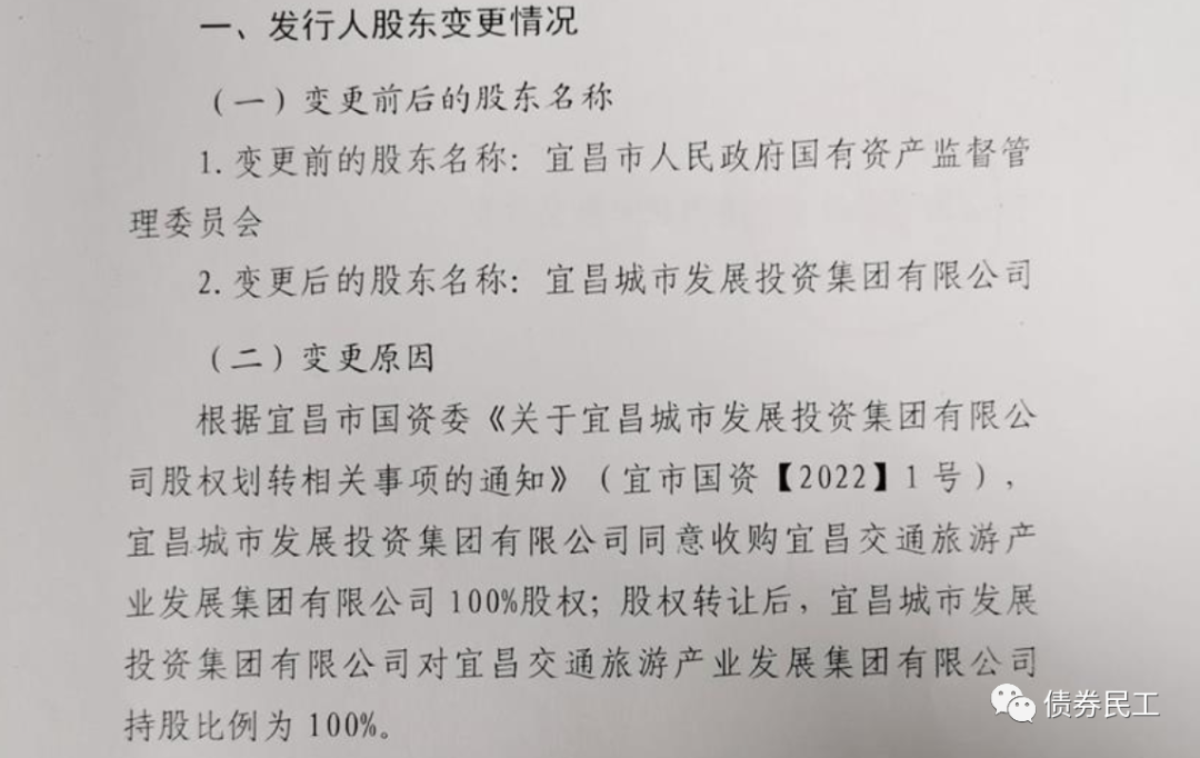 6、根據(jù)宜昌交通旅游產(chǎn)業(yè)發(fā)展集團(tuán)有限公司(主體信用等級(jí)AA)2022年1月25日的公告,宜昌城市發(fā)展投資集團(tuán)同意收購(gòu)宜昌交通旅游產(chǎn)業(yè)發(fā)展集團(tuán)100%股權(quán);股權(quán)轉(zhuǎn)讓后,宜昌城市發(fā)展投資集團(tuán)對(duì)公司的股權(quán)比例為100%。宜昌城市發(fā)展投資集團(tuán)(主體信用等級(jí)AA+),存續(xù)債券金額164.50億元。