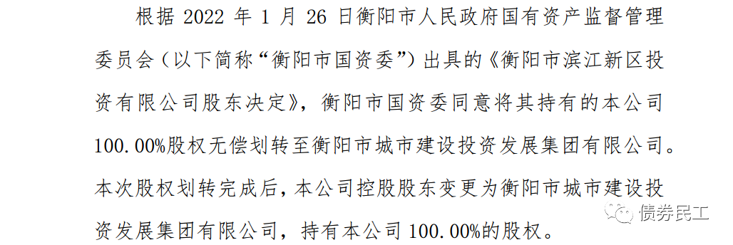 4、根據(jù)衡陽(yáng)市濱江新區(qū)投資有限公司(主體信用等級(jí)AA)2022年1月28日的公告,衡陽(yáng)市國(guó)資委同意將其持有的公司100.00%股權(quán)無(wú)償劃轉(zhuǎn)至衡陽(yáng)市城市建設(shè)投資發(fā)展集團(tuán)有限公司。衡陽(yáng)市城市建設(shè)投資發(fā)展集團(tuán)有限公司(主體信用等級(jí)AA+)存量債券金額為333億元,存量債券28只。