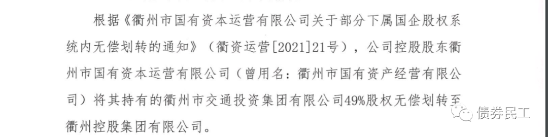 8、根據(jù)衢州市交通投資集團(tuán)有限公司(主體信用等級(jí)AA+)2022年1月17的公告,公司控股股東衢州市國(guó)有資本運(yùn)營(yíng)有限公司將其持有的公司49%股權(quán)無(wú)償劃轉(zhuǎn)至衢州控股集團(tuán)有限公司。衢州市國(guó)有資本運(yùn)營(yíng)有限公司(主體信用等級(jí)AA+),存量債券金額為106.50億元。