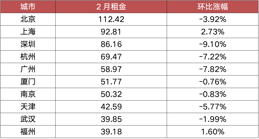 各城市之間租金水平分化,2月最低租金出現在河北保定,平均租金為16.31元/平方米/月。