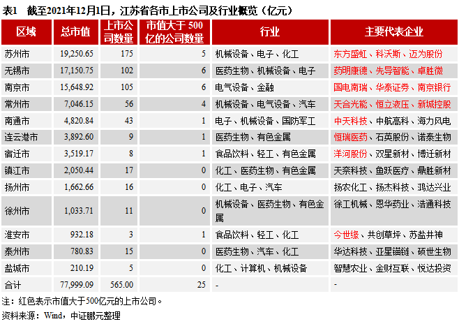 蘇州、南京、無錫上市公司數(shù)量最多,工業(yè)發(fā)展程度高,淮安、鹽城、宿遷上市公司較少,工業(yè)發(fā)展相對(duì)薄弱。蘇州、南京、無錫上市公司數(shù)量均在百家以上,總市值規(guī)模均超萬億,數(shù)量和市值規(guī)模明顯超過其他城市,大型上市公司(市值超過500億)代表行業(yè)龍頭企業(yè),更有利于產(chǎn)業(yè)集聚,其中蘇州主要集中于機(jī)械設(shè)備、電子和化工行業(yè),以東方盛虹、科沃斯、邁為股份為代表,無錫主要集中于醫(yī)藥生物、機(jī)械設(shè)備、電子行業(yè),以藥明康德、先導(dǎo)智能、卓勝微為代表,南京主要集中于電氣設(shè)備、金融行業(yè),以國(guó)電南瑞、華泰證券、南京銀行為代表。常州、南通上市公司數(shù)量及市值規(guī)模處于第二梯隊(duì),工業(yè)實(shí)力較強(qiáng),常州大型上市公司較多,南通僅有中天科技1家。其余地級(jí)市上市公司數(shù)量相對(duì)較少,尤其是淮安、鹽城、宿遷,工業(yè)發(fā)展水平相對(duì)薄弱,連云港、宿遷分別擁有恒瑞醫(yī)藥和洋河股份,總市值規(guī)模尚可,對(duì)區(qū)域產(chǎn)業(yè)鏈有帶動(dòng)作用。