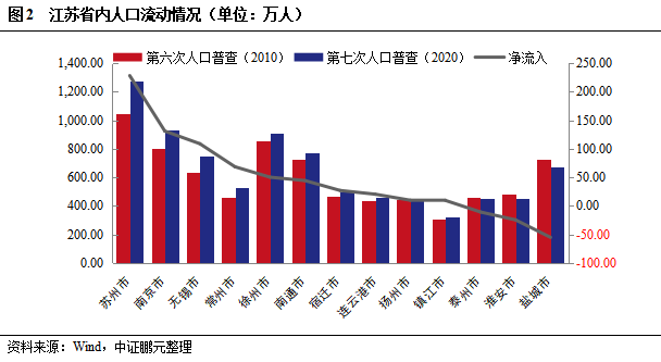 省內(nèi)人口整體呈現(xiàn)由北及南流動(dòng)趨勢(shì)。得益于蘇南在經(jīng)濟(jì)、教育、產(chǎn)業(yè)和政策等方面的優(yōu)勢(shì),近年不斷吸引大量人口凈流入,促進(jìn)了區(qū)域經(jīng)濟(jì)的快速發(fā)展。而蘇北經(jīng)濟(jì)相對(duì)落后,人口吸附能力不強(qiáng),鹽城、淮安、泰州甚至呈現(xiàn)凈流出的態(tài)勢(shì)。