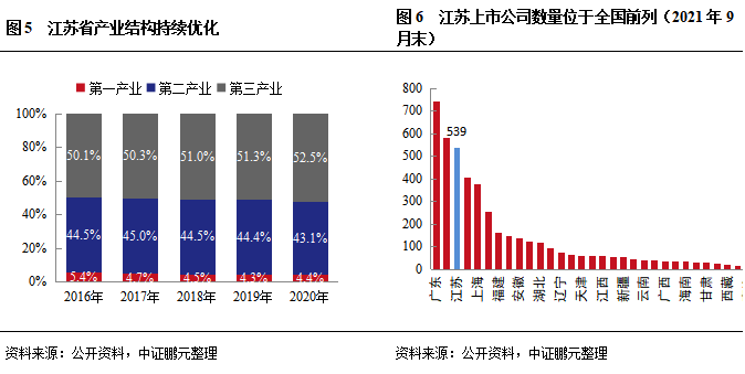 江蘇省產(chǎn)業(yè)結(jié)構(gòu)合理,工業(yè)實(shí)力雄厚,上市公司數(shù)量居全國(guó)第三。近年來江蘇省產(chǎn)業(yè)結(jié)構(gòu)不斷優(yōu)化,第三產(chǎn)業(yè)占比持續(xù)提升,三產(chǎn)結(jié)構(gòu)由2016年的5.4:44.5:50.1變?yōu)?020年的4.4:43.1:52.5。具體來看,第二產(chǎn)業(yè)占比略有下降,但工業(yè)對(duì)于區(qū)域經(jīng)濟(jì)貢獻(xiàn)依然突出,江蘇省形成了以電子、電氣、機(jī)械等為代表的主導(dǎo)產(chǎn)業(yè),近年來大力發(fā)展信息技術(shù)、新能源、生物醫(yī)藥等高新技術(shù)產(chǎn)業(yè)及戰(zhàn)略性新興產(chǎn)業(yè),2020年兩者分別占規(guī)上工業(yè)總產(chǎn)值的46.5%和37.8%,工業(yè)轉(zhuǎn)型升級(jí)明顯,誕生了以恒瑞醫(yī)藥、藥明康德、國(guó)電南瑞、卓勝微、恒立液壓等為代表的龍頭企業(yè),并形成相應(yīng)的產(chǎn)業(yè)集群。截至2021年9月末,江蘇省A股上市公司達(dá)539家,居全國(guó)第三,工業(yè)實(shí)力雄厚。2020年第三產(chǎn)業(yè)中批發(fā)與零售業(yè)、房地產(chǎn)業(yè)和金融業(yè)增加值占比分別為21.3%、15.8%、14.7%,行業(yè)分布較為均勻,有助于整體穩(wěn)定。