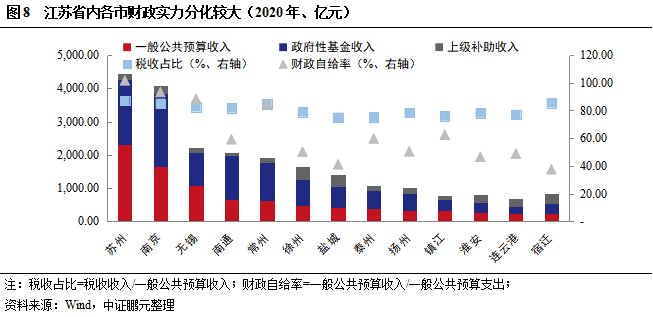 南京與蘇州財(cái)政實(shí)力絕對(duì)領(lǐng)先,鎮(zhèn)江、淮安、連云港和宿遷財(cái)政實(shí)力相對(duì)較弱;蘇南(除鎮(zhèn)江)財(cái)政自給率較高,宿遷、連云港、淮安、鹽城則處于較低水平;南通、常州、鹽城、徐州等地土地財(cái)政依賴度較高。2020年,蘇州、南京財(cái)政實(shí)力(一般公共預(yù)算收入+政府性基金收入+上級(jí)補(bǔ)助收入)強(qiáng),遠(yuǎn)超其他城市,分別達(dá)4,448.21億元和4,100.50億元,主要得益于發(fā)達(dá)的經(jīng)濟(jì)水平、較強(qiáng)的稅收產(chǎn)出能力和大規(guī)模的土地出讓;無錫、南通、常州、徐州財(cái)政實(shí)力較強(qiáng),處于第二梯隊(duì),在1,500-2,500億元之間;鹽城、泰州、揚(yáng)州財(cái)政實(shí)力在省內(nèi)屬于一般水平,處于第三梯隊(duì),在1,000-1500億元之間;而宿遷、淮安、鎮(zhèn)江和連云港財(cái)政實(shí)力相對(duì)較弱,分別為826.70億元、798.35億元、783.47億元和680.19億元。質(zhì)量方面,各市稅收收入占一般公共預(yù)算收入的比例均在75%以上,一般公共預(yù)算收入質(zhì)量較高。財(cái)政自給率方面,蘇州、南京、無錫、常州財(cái)政自給率均在80%以上,財(cái)政自給率較高,而宿遷、連云港、淮安、鹽城財(cái)政自給率不足50%,處于較低水平。需關(guān)注的是,南通、常州、鹽城、徐州政府性基金收入占比超過60%,土地財(cái)政依賴度較高,在房地產(chǎn)下行周期中,其財(cái)政實(shí)力受到的影響更為明顯。