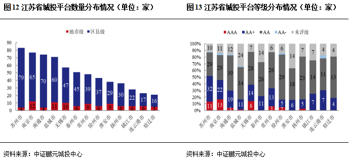 江蘇省城投數(shù)量居全國(guó)首位,各市城投平臺(tái)以區(qū)縣級(jí)為主,蘇南地區(qū)高等級(jí)平臺(tái)占比較高。本報(bào)告統(tǒng)計(jì)范圍內(nèi)的江蘇省城投平臺(tái)共650家,居全國(guó)首位。按地級(jí)市劃分,蘇州、南京、南通和鹽城城投平臺(tái)數(shù)量居多,分別為83家、77家、74家和71家。鎮(zhèn)江、連云港和宿遷城投平臺(tái)不足30家。其余各市平臺(tái)數(shù)量在30-60家之間。從行政級(jí)別來看,江蘇省各市城投平臺(tái)均以區(qū)縣級(jí)為主,區(qū)縣平臺(tái)數(shù)量占比均在70%以上。從平臺(tái)級(jí)別分布來看,AAA級(jí)平臺(tái)主要集中在蘇州、南京和無錫;鹽城、泰州、淮安未評(píng)級(jí)城投平臺(tái)數(shù)量較多。