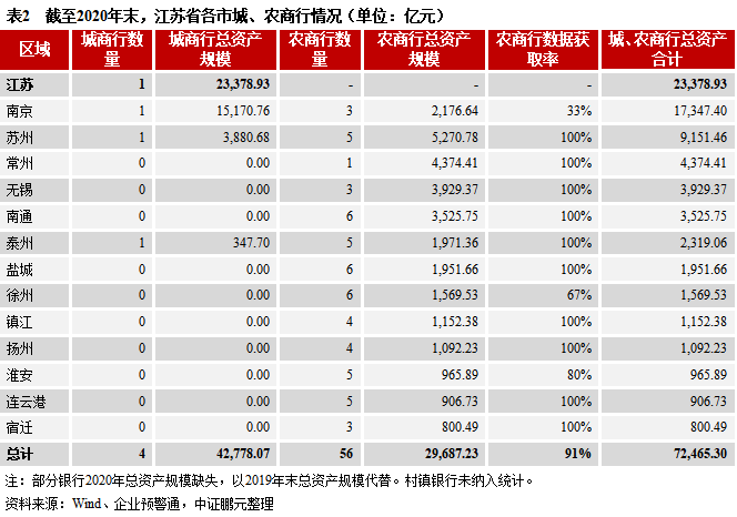 由于城農(nóng)商行貸款主要集中于本地,且對(duì)地方城投融資支持力度較大,與地方政府關(guān)系密切,出現(xiàn)突發(fā)事件時(shí)便于政府協(xié)調(diào)金融資源。具體來看,城商行方面,江蘇省內(nèi)共有4家城商行,分別是江蘇銀行、南京銀行、蘇州銀行和江蘇長(zhǎng)江商業(yè)銀行(靖江市)。江蘇銀行及南京銀行總資產(chǎn)規(guī)模均超萬億元,蘇州銀行和江蘇長(zhǎng)江商業(yè)銀行總資產(chǎn)規(guī)模相對(duì)較小。農(nóng)商行方面,蘇州5家農(nóng)商行合計(jì)總資產(chǎn)規(guī)模超過5,000億元,其次是常州。南京共3家農(nóng)商行,分別是江蘇紫金農(nóng)商銀行、溧水區(qū)農(nóng)村商業(yè)銀行和高淳區(qū)農(nóng)村商業(yè)銀行,溧水區(qū)農(nóng)村商業(yè)銀行和高淳區(qū)農(nóng)村商業(yè)銀行總資產(chǎn)規(guī)模數(shù)據(jù)缺失,故南京農(nóng)商行總資產(chǎn)規(guī)模有所低估。整體來看,江蘇省銀行資源集中在蘇南地區(qū),省會(huì)南京城、農(nóng)商行總資產(chǎn)規(guī)模合計(jì)值超17,000億元,蘇州城、農(nóng)商行總資產(chǎn)規(guī)模合計(jì)值在9,000億元左右,其余地區(qū)城農(nóng)商行總資產(chǎn)規(guī)模合計(jì)值不足5,000億元。