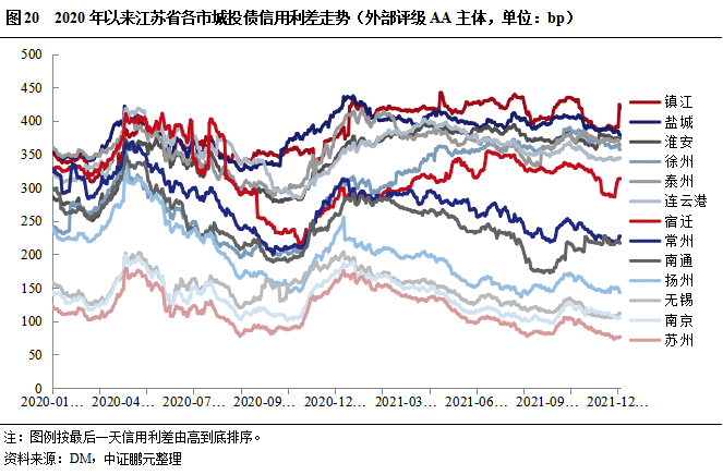 江蘇省各市城投債信用利差分化較為明顯,鎮(zhèn)江、泰州、鹽城、淮安、連云港城投信用利差較高,而蘇州、南京、無錫、常州、南通、揚(yáng)州城投信用利差相對(duì)較低,徐州和宿遷結(jié)構(gòu)分化較大,高等級(jí)(AA+)城投信用利差較低,低等級(jí)(AA)城投信用利差較高。鎮(zhèn)江、泰州、鹽城、淮安、連云港經(jīng)濟(jì)財(cái)政實(shí)力相對(duì)偏弱,城投平臺(tái)數(shù)量眾多,存在融資無序、政府管控不嚴(yán)等情況,債務(wù)規(guī)模較大,債務(wù)率較高,存在較大的償債壓力,其信用利差較高,反映了其風(fēng)險(xiǎn)補(bǔ)償情況。蘇南(除鎮(zhèn)江)、南通經(jīng)濟(jì)財(cái)政實(shí)力較強(qiáng),債務(wù)率尚可,金融資源豐富,信用利差較低。