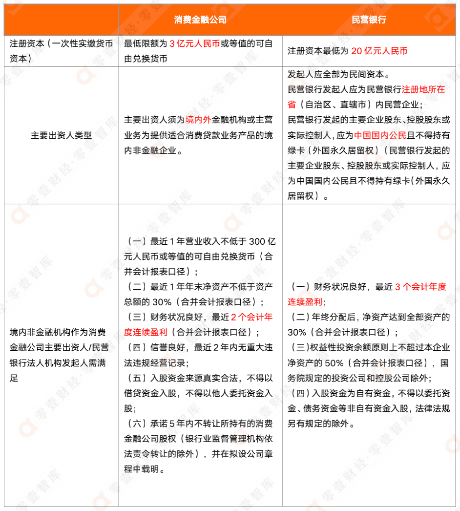 表:消費金融公司與民營銀行設立條件對比