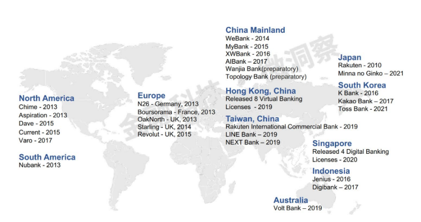通過對比歐美先進國家與亞洲新興國家的數字銀行發起機構及運營模式,我們發現兩者執行的是差異化發展路線: