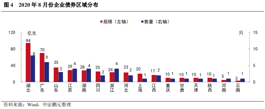 2020年8月,共有16個省份發行了企業債券。其中,湖北省企業債券的發行規模最大,為94.29億元;其次是廣東省發行了70億元,位居第二位;江蘇省和湖南省分別發行28.70和28億元億元,規模也較大。從發行數量上看,湖北省發行8只,廣東省發行6只,江蘇省、湖南省和浙江省分別發行4只,其他城市發行數量在3只及以下。與上年同期相比,8月有11個省份發行規模較上年增長,其中,湖北省上年同期未發行,本期發行規模大幅增長,此外,四川省和廣東省分別增長68.7%和55.6%,漲幅較大;5個省份發行規模較上年減少,其中,陜西省發行規模同比下降66.7%,降幅最大。