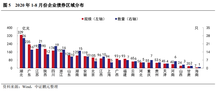 綜合2020年1-8月份情況來看,湖北省以328.79億元的發行規模位居首位;廣東省以235億元的發行規模位居第二;江蘇省和陜西省分別發行192億元和 190億元,四川省和浙江省分別發行173.50億元和155.10億元,其余省份發行規模在150億元以下。從發行數量上看,湖北省發行26只,位居首位;江蘇省發行21只,位居第二位;四川省發行19只,廣東省和浙江省各發行16只,其他省份發行數量在15只及以下。與上年同期相比,12個省份發行規模出現增長,其中,上海的企業債發行規模累計同比增長242%,陜西省發行規模同比增長174%,湖北省和福建省漲幅也在130%以上;10個省份發行規模出現下降,山西省和貴州省下降幅度在60%以上,降幅較大;此外,東北三省和新疆、西藏尚未發行。