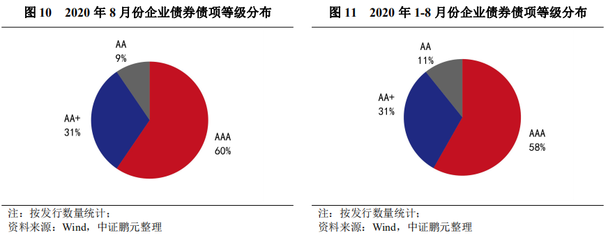2020年8月發行的企業債債項信用等級在AA+級及以上。具體來看,AAA級發行25只,占比60%,較上月下降12個百分點;AA+級發行了13只,占比31%,較上月上升3個百分點;AA級發行4只,占比9%,上月未發行。總體而言,8月發行AA+及以上的高級別品種數量占比91%,較上月下降9個百分點。綜合2020年1-8月情況來看,AAA級占比58%,同比上升17個百分點;AA+級占比31%,同比上升1.1個百分點;AA級占比11%,同比下降18.2個百分點。