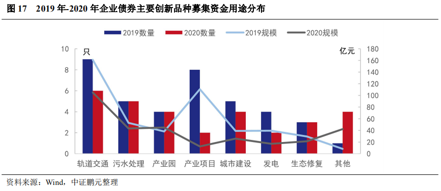 從募集資金用途看,綠色企業債主要用于軌道交通項目,其次是污水處理、城市建設和產業園區等,其中城市建設包括海綿城市、智慧城市等。與2019年相比,本年用于產業升級項目的綠色債較少,用于污水處理、綠色產業園、城市建設和生態修復的綠色企業債數量較多。隨著縣城新型城鎮化建設的推進,智能化、綠色化要求提升,未來綠色企業債的發展存在發展空間。