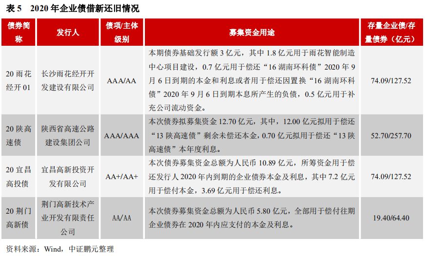 8月有3只企業債的募集資金用途涉及借新還舊,分別是“20雨花經開01”、“20宜昌高投債”和“20荊門高新債”,截至8月末共有4只企業債用于償還存量債券。2020年初,受新冠肺炎疫情影響,發改委曾在2月指出,“對于自身資產質量優良、募投項目運營良好,但受疫情影響嚴重的企業,允許申請發行新的企業債券專項用于償還2020年內即將到期的企業債券本金及利息。”