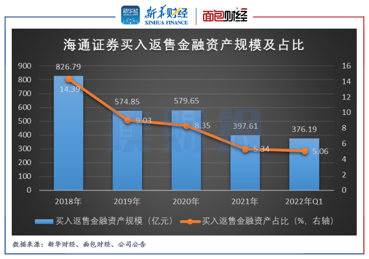 2022年一季末,海通證券的買入返售金融資產為376.19億元,較上年年末下降5.39%。2018年以來,公司的買入返售金融資產規模及占總資產的比例整體呈下滑趨勢,公司或意欲控制該業務所帶來的信用風險。
