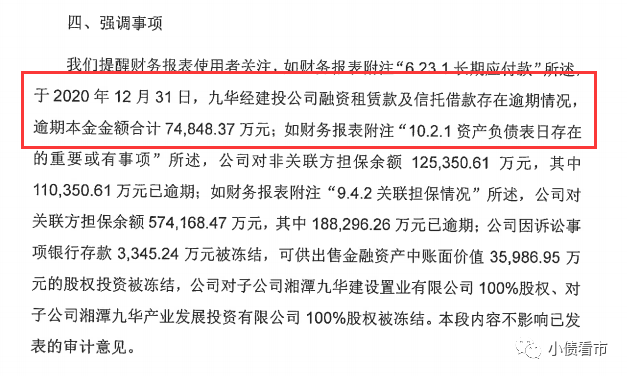 7月1日,湘潭九華經濟建設投資有限公司(以下簡稱“九華建投”)披露2020年財報顯示,截至2020年末其融資租賃款及信托借款存在逾期情況,逾期本金金額合計約7.48億元。