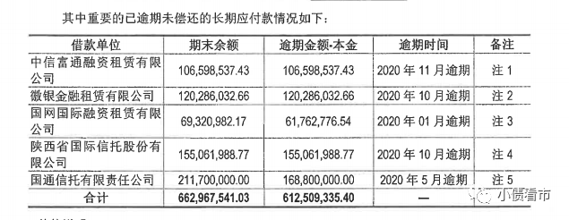 財報顯示,九華建投逾期非標融資債權機構分別為中信富通融資租賃本金1.06億元;微銀金融租賃1.2億元;國網國際融資租賃本金6176萬元;陜西省國際信托本金1.55億元以及國通信托本金為1.69億元。