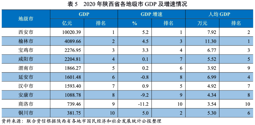 陜西各地級(jí)市發(fā)展較不均衡,分化較為明顯,省會(huì)西安市集聚效應(yīng)較為明顯,規(guī)模優(yōu)勢顯著,榆林市、寶雞市和咸陽市依次排序,各地級(jí)市經(jīng)濟(jì)水平均與西安市差距較大。陜西省各地級(jí)市2020年GDP增速普遍放緩,部分地級(jí)市出現(xiàn)較大幅度下降甚至表現(xiàn)為負(fù)增長。