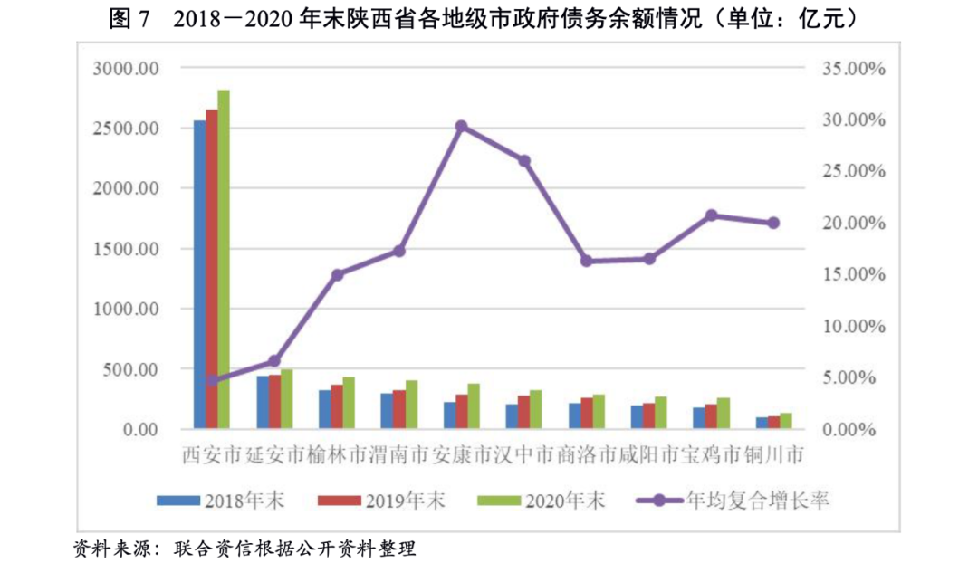 從政府債務(wù)層面看,陜西省各地級(jí)市政府債務(wù)余額規(guī)模均持續(xù)走擴(kuò),除西安市外,其他地級(jí)市2018-2020年末年均復(fù)合增長率均超過10%,其中安康市和漢中市年均復(fù)合增長率均超過25%。2020年末省會(huì)西安市政府債務(wù)余額大幅領(lǐng)先其他地級(jí)市,約占陜西省政府債務(wù)余額的1/3,其次是延安市、榆林市及渭南市,以上3個(gè)地市政府債務(wù)余額均在400億元以上,其余地級(jí)市政府債務(wù)余額均在400億元以下,其中銅川市政府債務(wù)余額規(guī)模最小,為134.11億元。