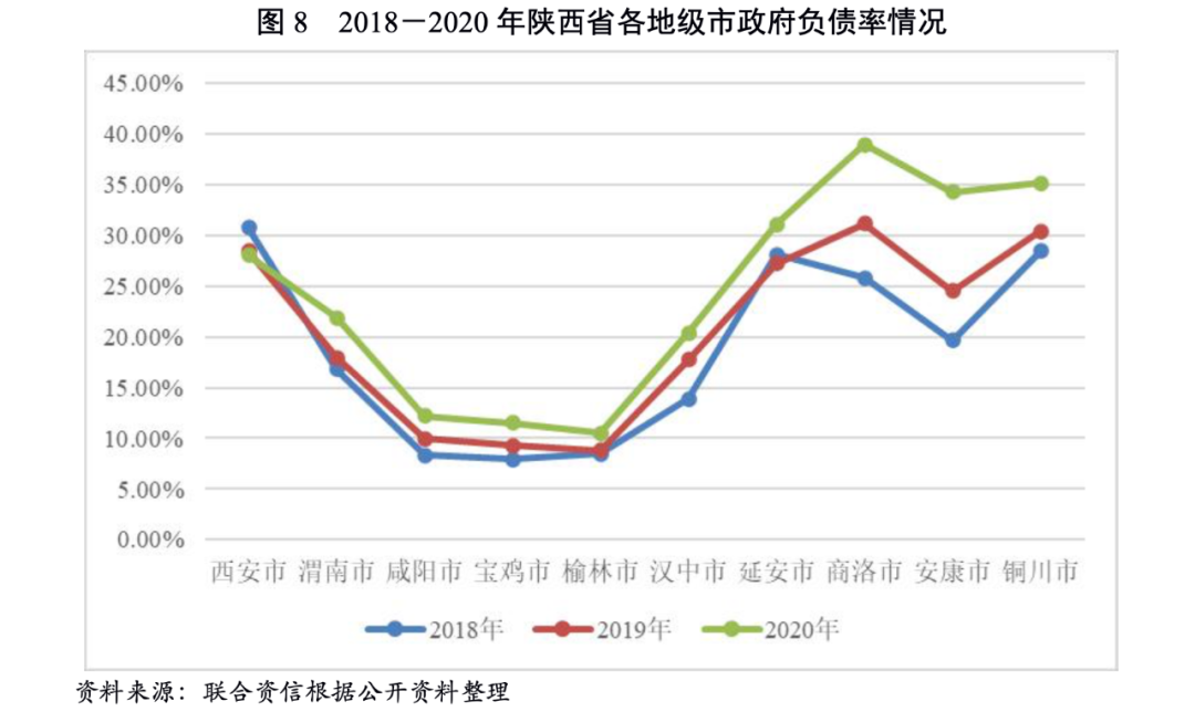 債務(wù)負(fù)擔(dān)方面,2018-2020年,除西安市外,其他地級(jí)市政府負(fù)債率均呈增長態(tài)勢。2020年,商洛市政府負(fù)債率為省內(nèi)最高(38.92%),較上年增長7.77個(gè)百分點(diǎn),商洛市政府負(fù)債率增長最快(同比上升9.76個(gè)百分點(diǎn))。同期,榆林市、寶雞市和咸陽市政府負(fù)債率均低于20%。