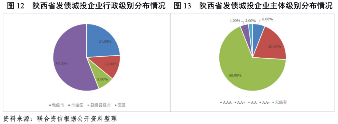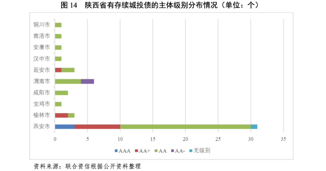 陜西省發(fā)債城投企業(yè)數(shù)量相對較少,信用等級(jí)以AA為主,AA+及以上的發(fā)債城投企業(yè)集中在西安市、榆林市和延安市。從行政區(qū)域看,陜西省發(fā)債城投企業(yè)集中在西安市,且以園區(qū)類城投企業(yè)為主。