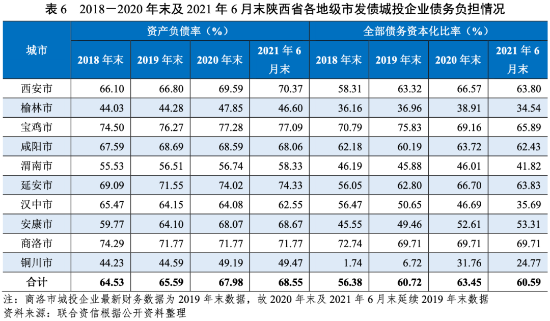 從發(fā)債城投企業(yè)全部債務(wù)與“發(fā)債城投企業(yè)全部債務(wù)+地方政府債務(wù)”的比值看,截至2020年末,西安市比值最高,達(dá)71.76%,延安市和咸陽市的比值超過50%,漢中市比值最低,為14.52%。