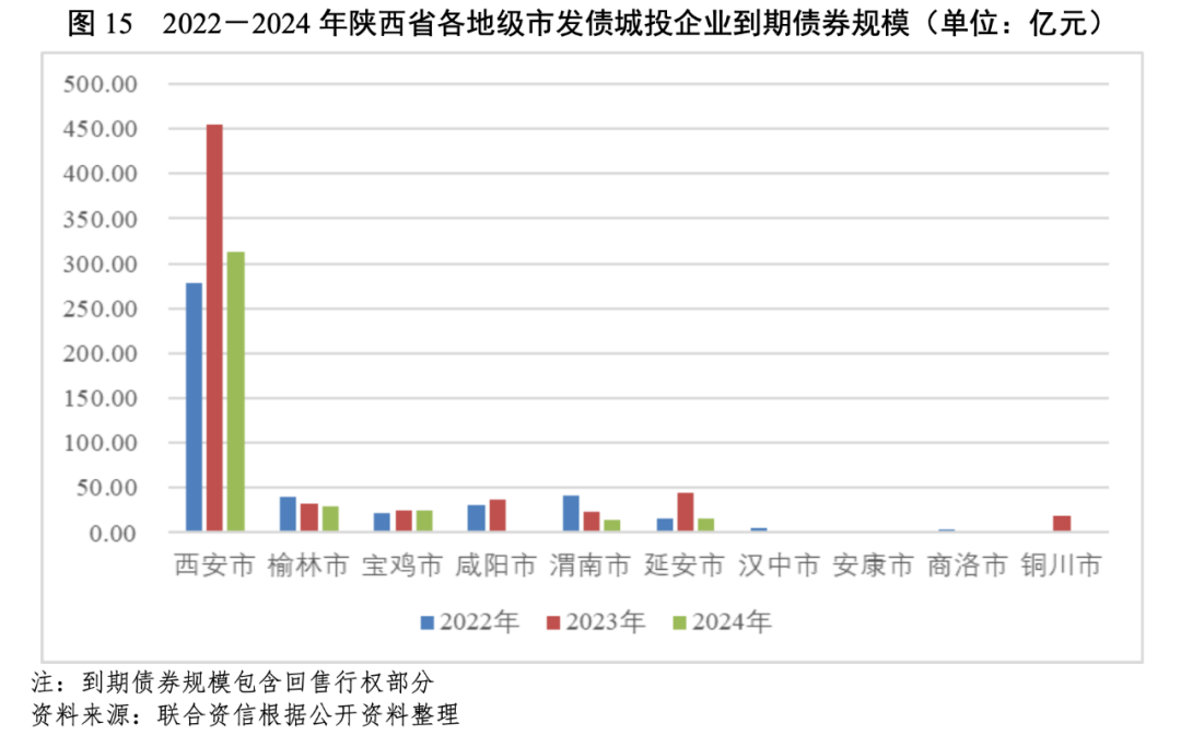 陜西省各地級(jí)市的城投企業(yè)債務(wù)規(guī)模差異較大,其中西安市城投企業(yè)債務(wù)規(guī)模遙遙領(lǐng)先于其他地級(jí)市,西安市“發(fā)債城投企業(yè)全部債務(wù)+地方政府債務(wù)”/GDP的比值較高,債務(wù)負(fù)擔(dān)重。從綜合財(cái)力對地方債務(wù)的覆蓋程度來看,覆蓋程度有所分化,需關(guān)注面臨集中償付壓力和地區(qū)債務(wù)負(fù)擔(dān)較重的地級(jí)市的城投企業(yè)的再融資情況。