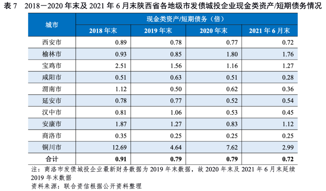 2020年以來,陜西省大部分發(fā)債城投企業(yè)債務(wù)負(fù)擔(dān)有所上升,貨幣資金對短期債務(wù)的覆蓋程度有所下降,其中咸陽市、延安市和漢中市短期償債能力相對較弱。