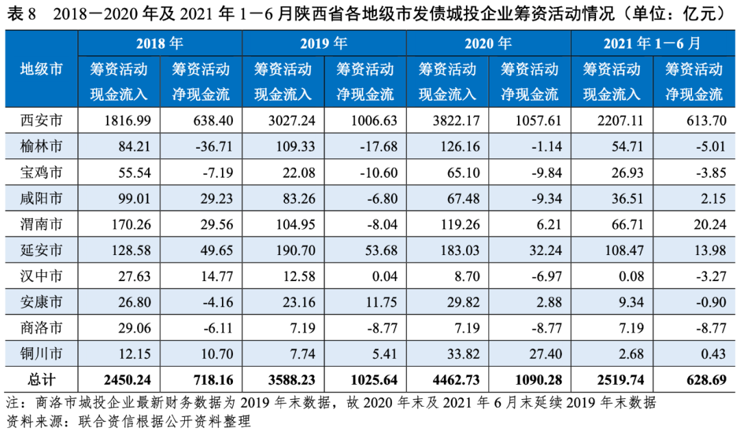 從陜西省各地級(jí)市發(fā)債城投企業(yè)籌資活動(dòng)凈現(xiàn)金流狀況來看,2018-2020年,陜西省發(fā)債城投企業(yè)整體籌資活動(dòng)現(xiàn)金流入和籌資活動(dòng)凈現(xiàn)金流均有所增長。具體來看,2020年,西安市發(fā)債城投企業(yè)融資需求仍較大,延安市、安康市和銅川市發(fā)債城投企業(yè)保持一定融資需求,渭南市發(fā)債城投企業(yè)融資需求有所擴(kuò)大,其他地級(jí)市發(fā)債城投企業(yè)融資需求不強(qiáng)。