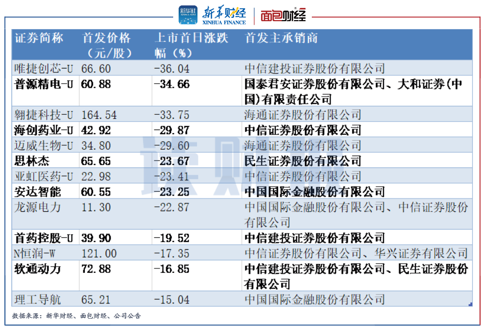 此外,中信建投和國泰君安以及大和證券分別主承銷了唯捷創芯-U和普源精電-U,在兩只新股上市首日,分別產生浮虧超5000萬元和超4000萬元。