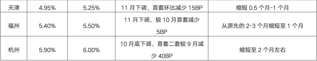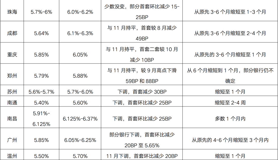 部分地區人民銀行分支行響應,開始對房地產信貸進行窗口指導,支持房貸政策適度松綁。近日多個熱點城市的按揭出現階段性回暖現象,放貸速度有所加快,從前期的“不確定”、“3-6個月基本是常態”已經調整為“1-3個月內”,而如杭州、蘇州、寧波、廣州、武漢、合肥、成都、鄭州和天津等熱點城市的房貸利率也較9月高點有明顯下調,11月居民中長期貸款顯著增長。