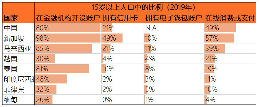 東南亞地區(qū)正規(guī)金融服務(wù)不足,基礎(chǔ)設(shè)施落后,產(chǎn)生了大量無(wú)銀行賬戶和銀行賬戶不足的人群。根據(jù)《e-Conomy SEA 2020》數(shù)據(jù),東南亞近4億成年人中,只有1.04億成年人完全擁有銀行賬戶、信用卡、投資和保險(xiǎn)服務(wù),充分享受金融服務(wù)。由于東南亞公共登記、身份識(shí)別系統(tǒng)及可信賴的信用信息缺失無(wú)法獲得信用卡等其他金融服務(wù),僅0.98億成年人擁有銀行賬戶。剩余1.98億成年人完全沒(méi)有任何賬戶服務(wù),主要原因是東南亞基礎(chǔ)建設(shè)能力較弱,金融機(jī)構(gòu)需要對(duì)所屬服務(wù)類目投入巨大開(kāi)支,才能滿足所有客戶需求。