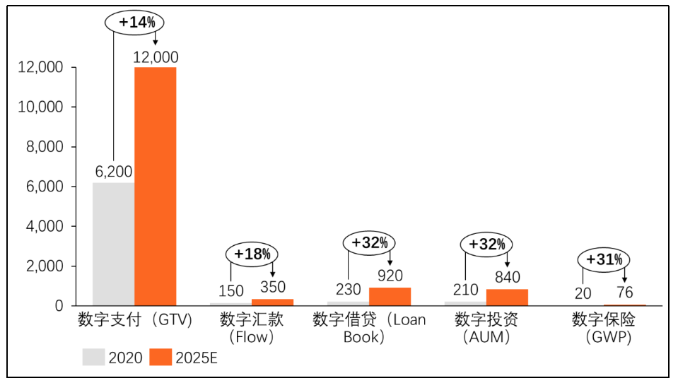 其中數(shù)字支付服務(wù)發(fā)展規(guī)模最大,目前數(shù)字支付總交易額(GTV)已達(dá)6200億美元,預(yù)計(jì)2025年總交易額(GTV)將達(dá)到12000億美元,主要來(lái)源于電商、打車等線上交易服務(wù)帶來(lái)的支付驅(qū)動(dòng)。此外盡管其他金融服務(wù)仍然處于初級(jí)數(shù)字化階段,但是據(jù)預(yù)測(cè)2020至2025年未來(lái)五年內(nèi),數(shù)字匯款、借貸、投資和保險(xiǎn)的滲透率將會(huì)有兩到三倍的增長(zhǎng),依次達(dá)到28%、8%、11%、9%。預(yù)計(jì)2020年-2025年均復(fù)合增長(zhǎng)率將依次達(dá)到18%、32%、32%、31%。