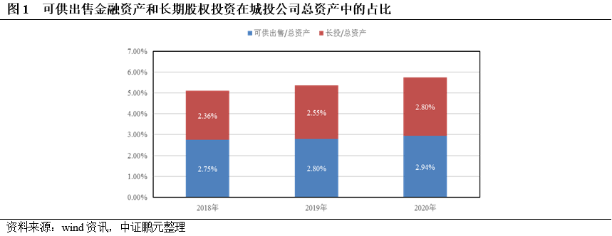 (2)城投公司開展金融投資在財報中最直接、最集中地體現在兩個科目中,一是“可供出售金融資產”,另一個是“長期股權投資”,2018-2020年上述兩大科目的期末余額在總資產中的占比均值之和分別為5.11%、5.35%、5.74%,而其他科目的期末余額在總資產中的占比均值之和分別為0.09%、0.30%、0.31%,另外,兩大科目的期末余額在總資產中的占比相差不大(見圖1);