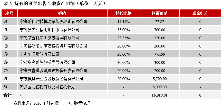 最后,再以寧海寧東新城開發投資有限公司為例。2020年底,其可供出售金融資產余額為1.61億元,均為按成本計量的可供出售權益工具(明細如下),投資標的所涉及的行業較為多元,包括商務服務業、金融服務業、公用事業等。不過,持有期間公司未收到被投資單位派發的現金紅利,亦未計提減值準備,故對公司盈利未產生影響。