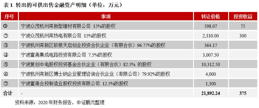 再以寧波杭州灣新區開發建設有限公司為例。2020 年末,公司可供出售金融資產余額由上年末的1.83 億元減少至0,主要系因公司根據杭州灣新區管委會相關文件與區域內其他國企之間進行了資產整合劃轉,其中公司轉出的資產中包括了其持有的按成本計量的可供出售權益工具(明細如下),轉讓價款合計21,892.24萬元。此外,2020年公司收到寧波眾茂杭州灣新型墻材有限公司和寧波眾茂杭州灣熱電有限公司的現金分紅款,共計375萬元,計入投資收益,占當年營業利潤的比重僅為3.20%,對公司盈利的貢獻度較低。