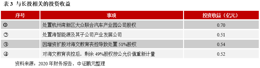 再以寧波杭州灣新區開發建設有限公司為例。2020年底,其長投余額為36.58 億元,較上年末增長12.66%。具體來看,該部分資產包括33.43億元的對合營企業投資和3.15億元的對聯營企業投資,均按權益法核算。其中,對合營企業投資中主要有對慈溪市開發公司投資32.72億元、對杭州灣新區濕地建設公司投資0.44億元;對聯營企業投資中主要有對杭州灣新區中石化油站發展公司投資0.55億元和對杭州灣新區海文教育發展公司投資1.76億元。相較2019年底,長投的增長主要來自于兩點:一是,慈溪開發公司本期資本公積增加 4.00 億元,“長期股權投資-其他權益變動”隨之增加;二是,原合并范圍內孫公司海文教育于2020年12月28日引入外部投資者(浙江綠城房地產投資有限公司),增資擴股導致公司之全資子公司寧波杭州灣濱海新城開發建設有限公司對其喪失控制權,故對相關長投視同處置后重新取得,也即按照增資擴股后的被投資單位凈資產份額確認新的投資成本,同時在合并報表中對喪控后剩余股權按照公允價值重新計量,最終確認1.76億元的對聯營企業投資。2020年,公司實現1.17億元營業利潤,其中投資收益1.75億元(見表3),反映出公司盈利對投資收益的依賴度極高。
