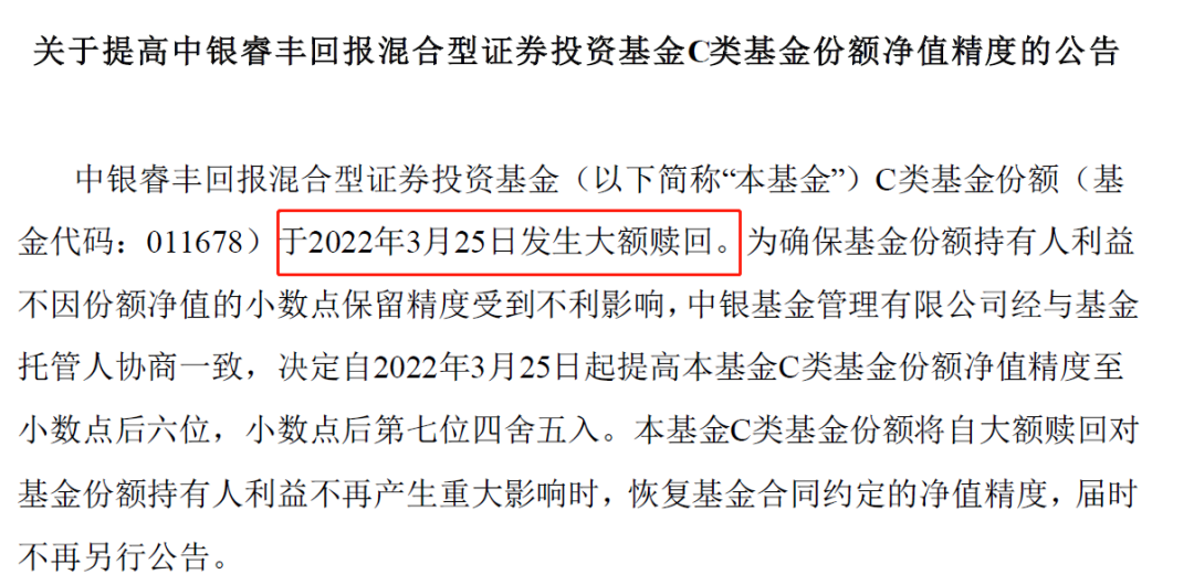 這一背景下,中銀基金旗下“固收+”產品中銀睿豐回報混合型證券投資基金3月26日公告稱該基金C類份額于3月25日發生大額贖回。為確保基金份額持有人利益不因份額凈值的小數點保留精度受到不利影響,決定自3月25日起提高C類基金份額凈值精度至小數點后六位,小數點后第七位四舍五入。