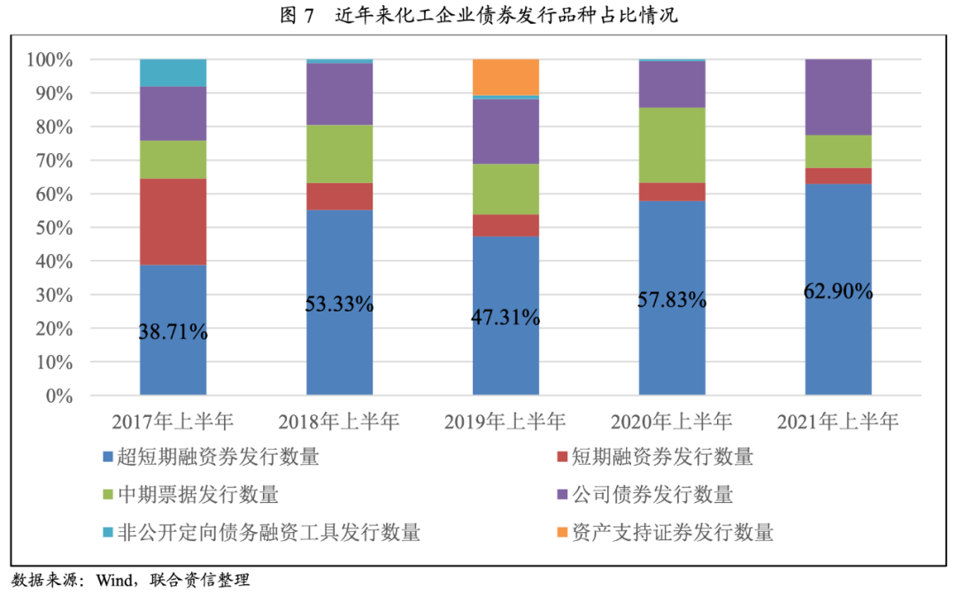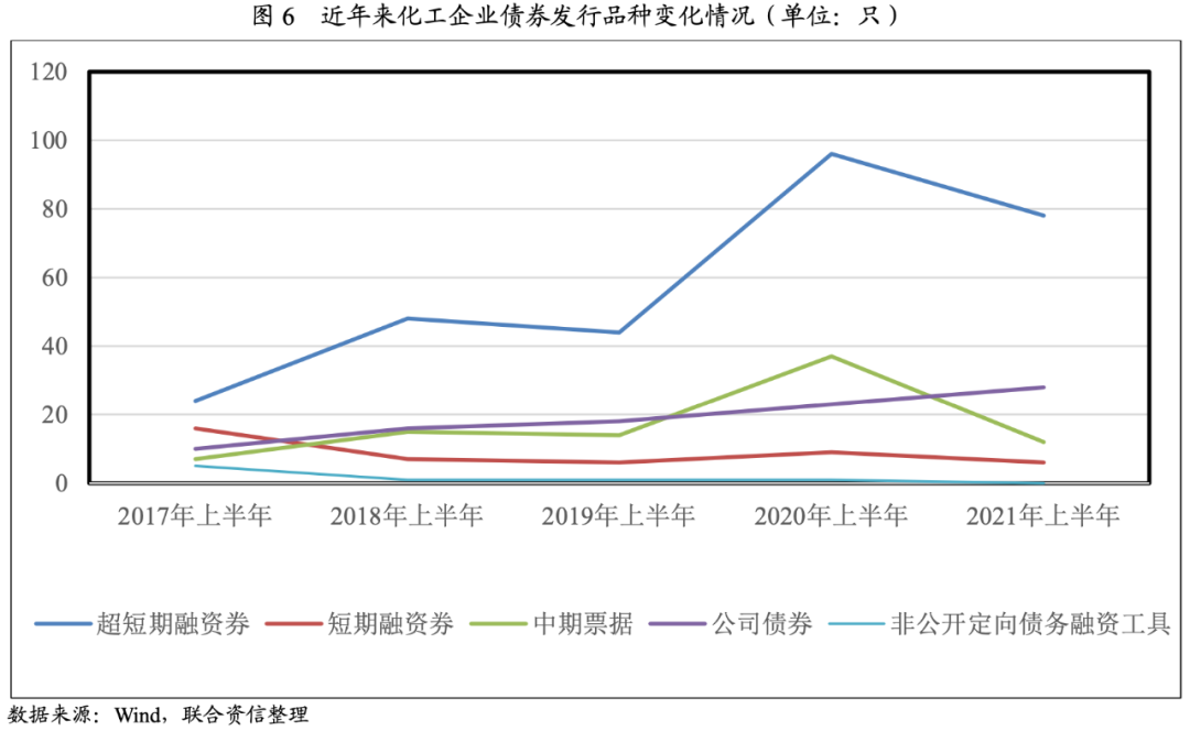 從發行品種來看,2021年上半年,化工企業發行信用債券中,超短期融資券同比減少18只,但仍為第一大品種,共計發行78只,占62.90%。公司債券發行量居第二位,共計發行28只,同比增加5只,占22.58%。其余為中期票據和短期融資券,分別發行12只和6只。2017年以來,超短期融資券均為化工行業上半年債券發行的第一大品種,且2021年占比達近年來高位;公司債券發行量近年來逐年增長,2021年上半年發行量占比首次超過20%。