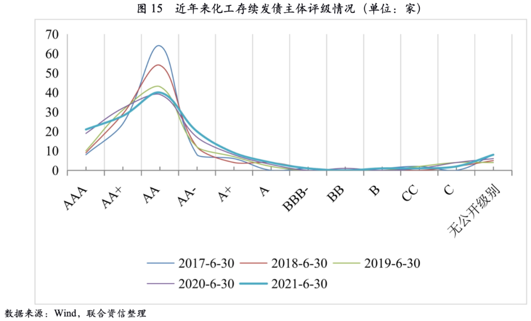 從化工行業有存續債券發行人信用等級來看,整體以AA為中樞近似呈正態分布,但隨著近年來信用債市場的發展,市場對企業信用區分度要求不斷提高,同時,企業自身信用資質也在不斷變化,化工行業存續發行企業信用等級分布較此前逐漸平滑,AA級別數量呈現減少并向兩端移動的趨勢。