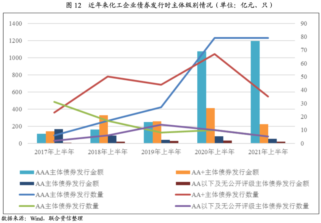 從相關債券發行時級別分布看,2021年上半年化工企業發行的124只信用債券發行時主體級別仍以AA+和AAA為主,AAA級別主體發行的信用債數量占比保持了近年來的逐年上升趨勢。截至2021年6月底,化工企業發行信用債券中,AAA級別主體信用債數量占比為63.71%,同比提高16.12個百分點,較非AAA主體債券發行數量優勢進一步擴大。AA及以下級別、無公開評級的主體債券發行數量占比合計未超過10%。上述情況反映了即使在當前大多數化工企業效益明顯好轉的背景下,面對國內和國際復雜多變的大環境,投資者對于高評級債項的偏好仍然未發生明顯變化。