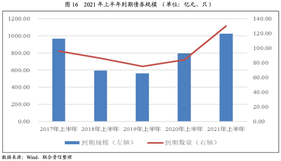 2021年上半年,化工行業債券到期規模為1024.40億元,同比增長28.92%;債券到期數量為130只,同比增長54.76%;主要系2020年新冠肺炎疫情爆發,為盡快恢復經濟,國內營造了階段性寬松的融資環境,化工行業發行的短期融資債券規模較大,上述部分短期融資債券在2021年上半年陸續到期。