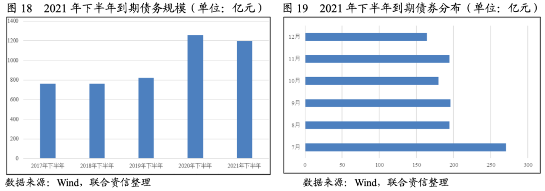 2021年下半年,化工行業債券到期規模為1198.39億元,同比下降4.72%,其中7月到期規模較大,為270.4億元,其余月份到期規模較為均衡。