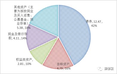 2017年,我國銀行理財(cái)29.54萬億,其大類資產(chǎn)配置狀況如下(見圖4):其一,債券投資占比42.2%,約12.47萬億,兼顧收益性與流動(dòng)性。其二,非標(biāo)和權(quán)益類資產(chǎn)投資占比25.7%,合計(jì)約7.59萬億,其中,非標(biāo)資產(chǎn)16.2%,權(quán)益類資產(chǎn)9.5%,后者主要是定增配資及明股實(shí)債等資產(chǎn),二者均主打收益性。其三,“現(xiàn)金及銀行存款”,以及“其他資產(chǎn)”占比32.1%,合計(jì)約9.48萬億,其中,現(xiàn)金及銀行存款13.9%,其他資產(chǎn)(主要為拆放同業(yè)及買入返售、公募基金、同業(yè)存單)18.2%,二者均主打流動(dòng)性。