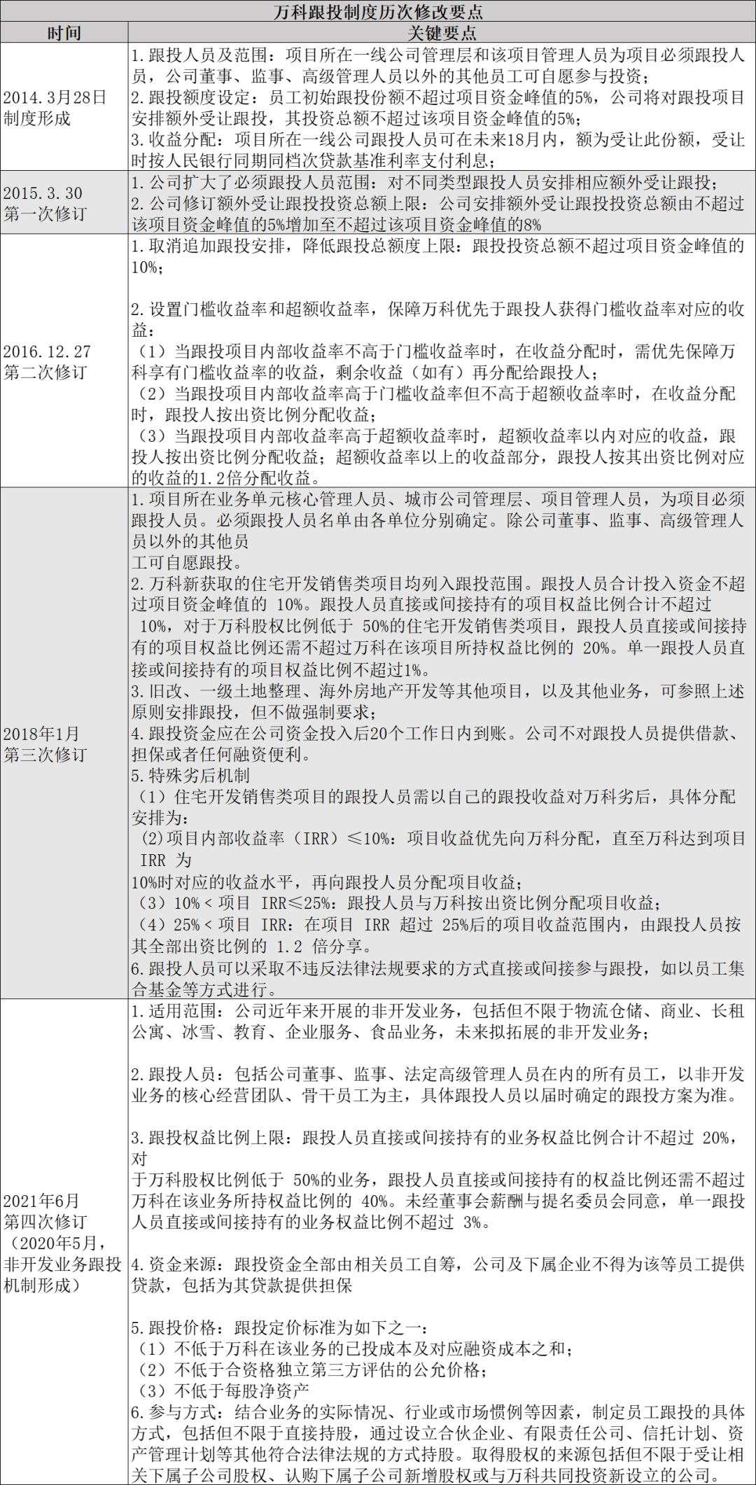 2020年5月,萬科提出《關于補充完善復雜項目及非開發業務跟投機制的議案》,在開發業務跟投機制基礎上,補充完善了復雜項目及非開發業務的跟投機制,此次萬科則是在去年的議案基礎上,對非開發業務跟投機制的跟投人員、權益比例、價格和資金來源等相關方面修訂了規定。