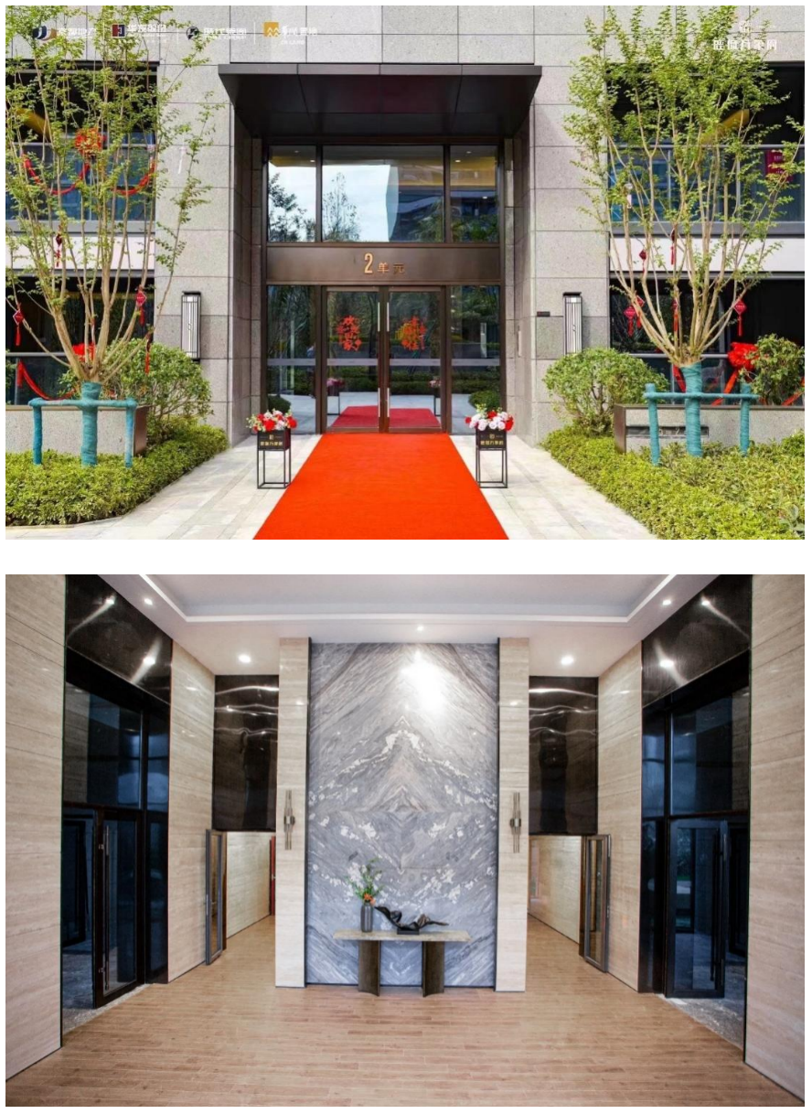 例如華潤置地溫州鹿城萬象府,其單元門采用古銅拉絲不銹鋼玻璃門,大堂外兩側設置石材景墻,古銅不銹鋼壓頂,景墻對稱布置,營造歸家儀式感。大堂二層挑空,5米高吊頂,藍金沙背景墻,配置軟裝掛畫和藝術擺件,為業主打造回家的尊貴感。
