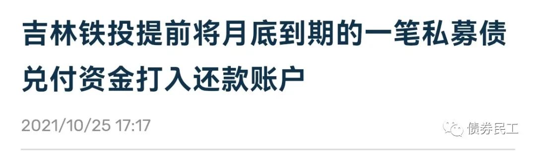 根據(jù)DM2021年10月25日的推送的信息,吉林市鐵路開發(fā)有限公司(以下簡稱“吉林鐵投”)提前將月底到期私募債兌付資金打入還款賬戶。根據(jù)公開信息查詢,這筆私募債應該是“18吉林鐵投PPN001”,到期日是2021年10月30日。