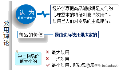 在效用價值論中,物品的價值量必須是由決定這一商品的福利的量決定的,而并不是決定于任何單位物品提供的主管效用,也不是決定于人對任何單位物品的主觀評價,而是決定于人民對最后單位物品的主觀評價,決定于最后單位物品能夠滿足人的最不重要的欲望即邊際欲望的大小。一件物品的價值,是由現(xiàn)有的同樣的一些物品所能滿足的一切需求中,最不迫切的那一具體需要的重要性來衡量的。而最不迫切的那一具體需求的重要性是指這個物品的邊際效用(增量)。